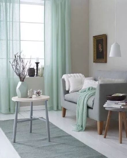 ▲ 清新的薄荷绿色的薄纱窗帘,材质轻盈透亮,随着微风时而摆动,划过一道道优美的弧线,成为家里的一道动人的风景线。