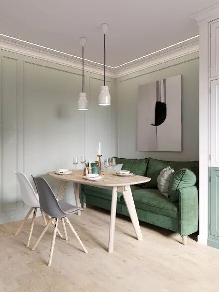 ▲ 墙壁使用了明度比正常薄荷绿低一些的绿,搭配灰色沙发,清冷的让薄荷绿的空间更显素雅沉静。