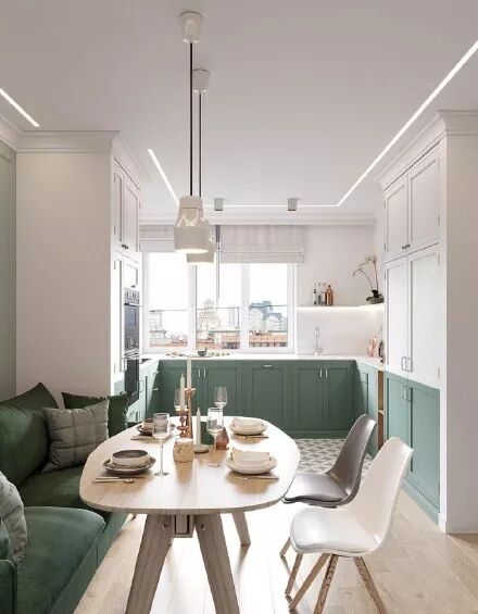 ▲ 当白色墙面邂逅薄荷绿厨柜,清新质朴的自然格调让人仿佛置身于温馨田园之中,燥热的厨房也有了那么一丝丝清凉。